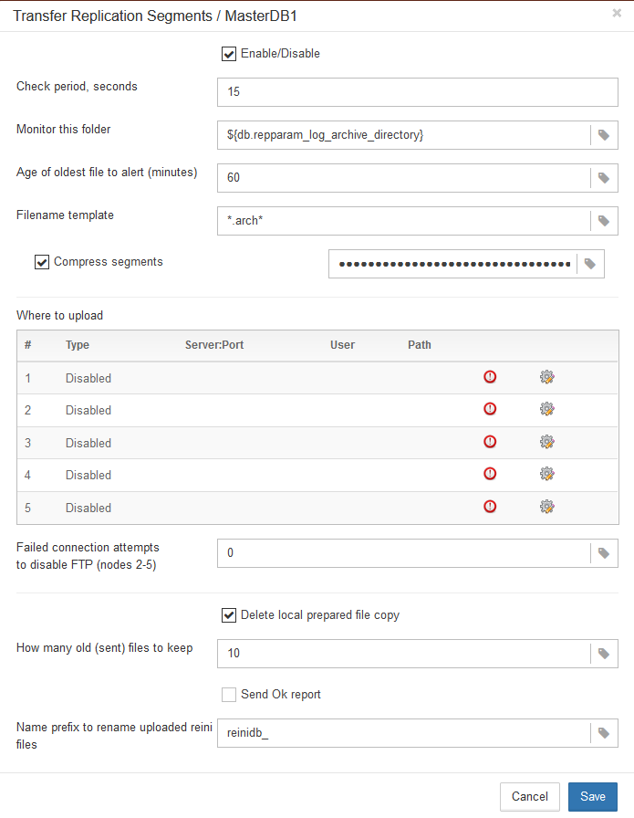 In a case of distributed environment, when the network connection between master and replica server is unstable, or with high latency, or when servers are in the different geographical regions, the best way to transfer replication segments will be through FTP or SSH.