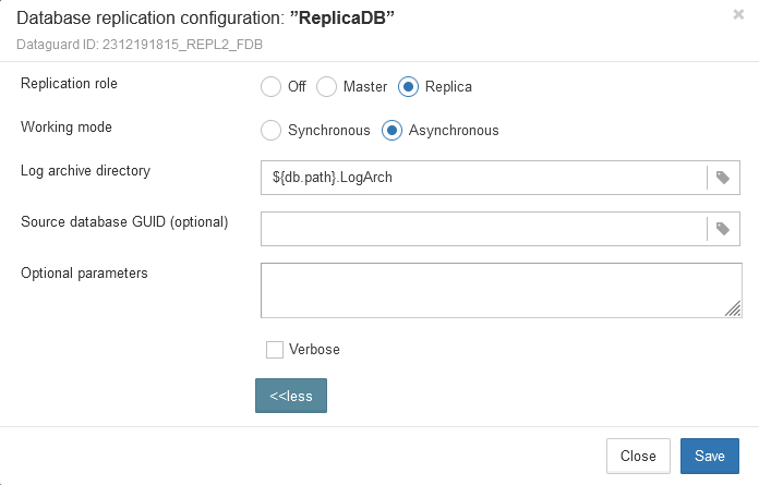 First, configure the replica database. For this, click on the replication settings dialog in the header pf the database, and choose Replica -> Asynchronous.